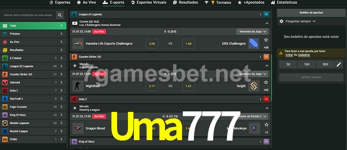 A aposta Uma777 oferece aos jogadores a experiência mais conveniente de apostas em eSports!